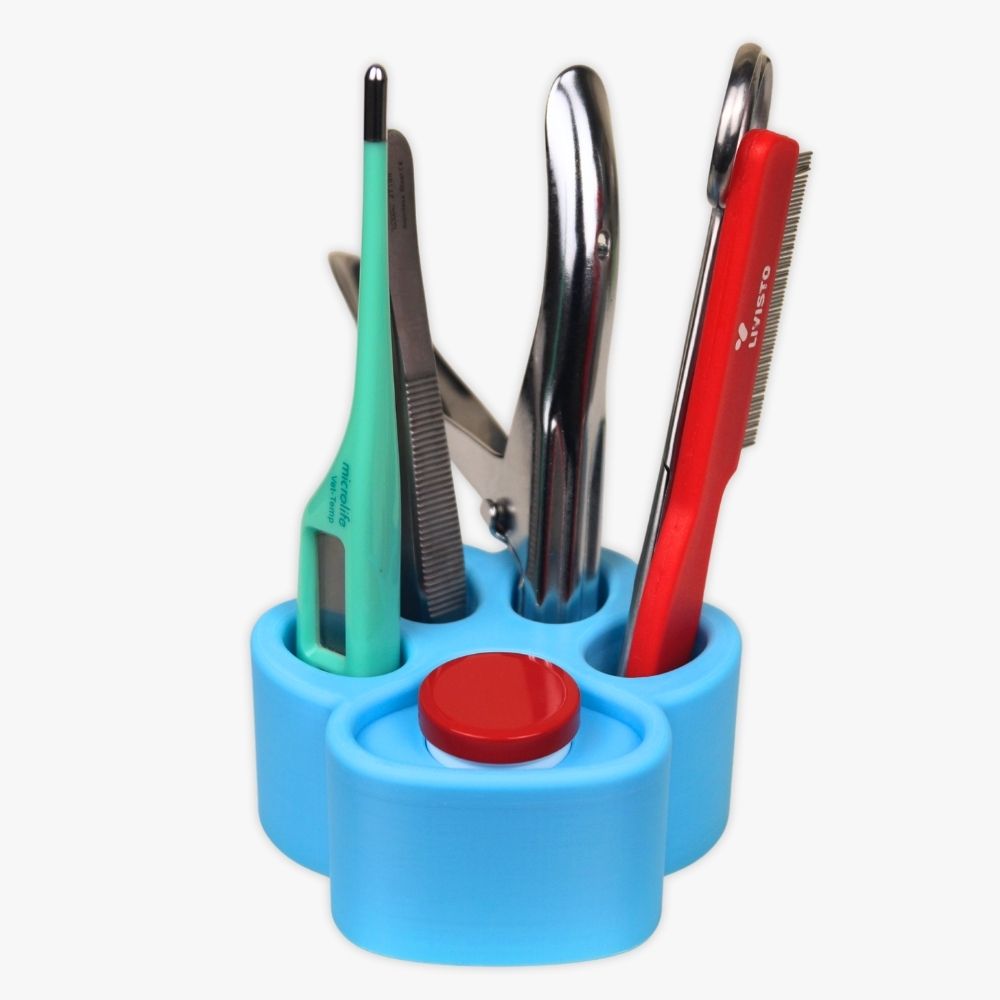 Mit unserer Multi-Tatze haben Sie alle wichtigen Utensilien immer griffbereit. In vier Öffnungen finden gängige Praxiswerkzeuge wie VET-Thermometer, Krallenschere, Pinzette oder ein kleiner Flohkamm Platz. Im Großballen befindet sich eine passgenaue Aufnahme für eine 10-g-Salbenkruke. Kippsicher, praktisch und mit liebevollem Design – für Ordnung, schnellen Zugriff und gute Laune im Praxisalltag.